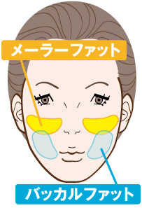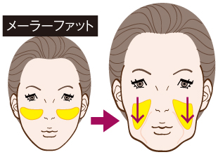 - 頬骨からほうれい線にかけて存在する脂肪。加齢によってメーラーファットの重みに耐えられなくなると頬がたるみ、ほうれい線の原因になります。除去することでほうれい線を解消しスリムな小顔にすることができます。