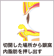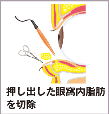 さらに瞼板筋と眼窩隔膜を最小限切開して眼窩内脂肪を押し出して、余分な脂肪を切除します。