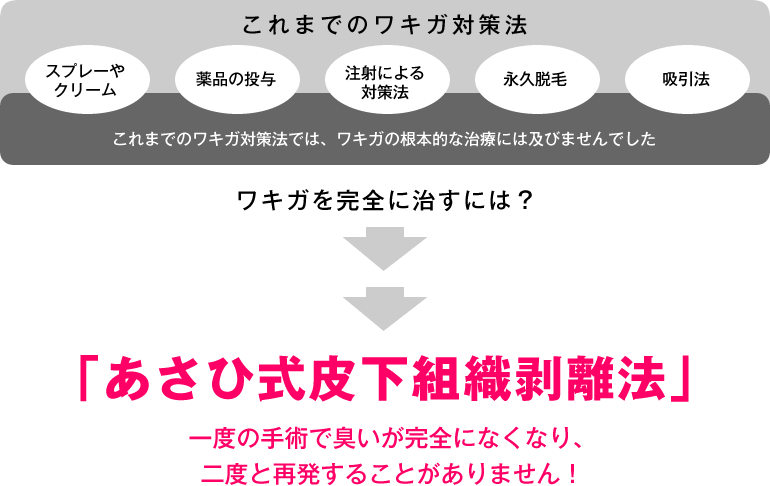 ただし何もせずに自然に完治するというわけではありません。スプレー消臭剤をお使いとのことですが、その場しのぎで汗やニオイを抑えているだけで、ワキガの根本的な解決にはなりません。安全かつ確実にワキガを治せる方法はあさひ式皮下組織剥離法が最適です。ワキガの原因を全て取り除き、たった一回の手術で完治できます。