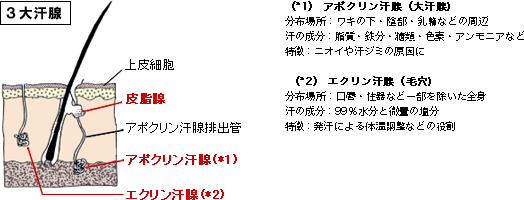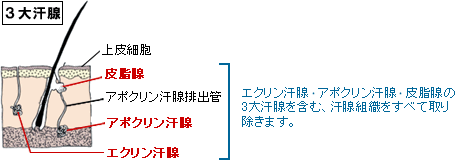 人間のヒフは3層に分かれており、一番下にある層を皮下組織といいます。この層にワキガの原因である「汗腺組織」があります。そして「アポクリン汗腺」から出てくる汗が衣類の汗ジミやニオイの原因物質といえます。ワキガ体質の方はこの「アポクリン汗腺」からの分泌物が多いのです。
