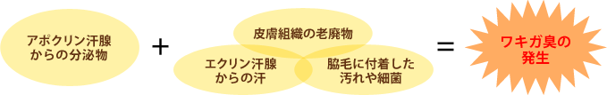ただし、アポクリン汗腺だけがワキガの原因となっているわけではありません。アポクリン汗腺から出る分泌物がホコリや雑菌、ヒフの老廃物などと結びつき、それがエクリン汗腺から出る汗と混ざり合って広がってあの独特な匂いを発生させてしまうのです。